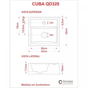 Medida da Cuba (C x L x P): 33cm x 30cm x 10cm