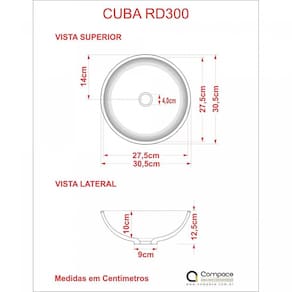 Medida da Cuba (C x L x P): 30,5cm x 30,5cm x 12,5cm