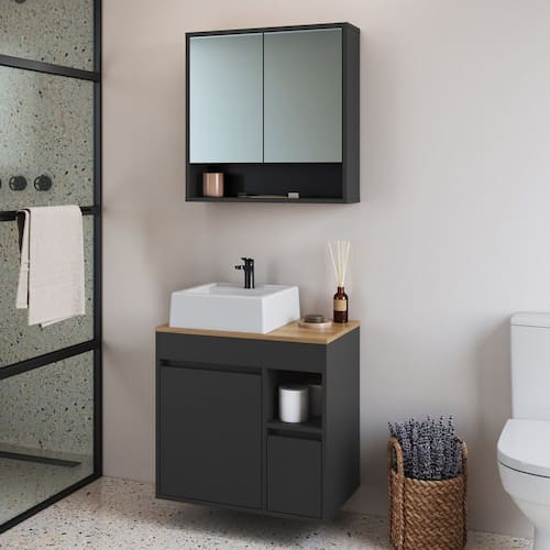 Conheça o conjunto gabinete para banheiro Art In Móveis, desenvolvido para otimizar o espaço e guardar pertences. Aproveite! Este produto foi produzido em excelente material MDP de madeira reflorestada ecologicamente correta e com acabamento Finish Foil Acetinado, que garante maior resistência e qualidade em seu móvel. A essência de criar soluções que trazem mais conforto sua vida. Esse é o grande diferencial dos produtos Art In Móveis. Cada nova ideia é uma mistura de criatividade, funcionalidade e muita dedicação. Produto acompanha cuba. Acabamento da Cuba: Liso Acabamento da Gaveta: Finish Foil Acabamento da Porta: Finish Foil Acabamento da Prateleira: Finish Foil Acompanha Cuba: Sim Acompanha Gaveteiro: Não Acompanha Manual de Instalação: Sim Acompanha Parafusos Para Fixação Na Parede: Sim Acompanha Tampo: Sim Acompanha Válvula: Não Altura do Espelho: 45 cm Ambiente Principal: Banheiro codigo_ean: 7900288278784 Complexidade da Montagem: Média: pode ser montado por mais de uma pessoa e/ou necessite de maior conhecimento para montagem Cor: Grafite Cor da Cuba: Branco Cor da Gaveta: Preto Cor da Porta: Preto Cor do Produto: Grafite Cor Flex: Não Cor Interna: Grafite Escala de Brilho: Fosco Escala de Brilho da Gaveta: Fosco Escala de Brilho da Porta: Fosco Escala de Brilho da Prateleira: Fosco Espessura do Espelho: 3 mm Formato da Cuba: Retangular Formato do Espelho: Retangular Formato Espelheira: Retangular Furação para Cuba e Torneira: Não Gaveta com Chave: Não Itens Inclusos: 1 Gabinete, 1 Espelheira, 1 Cuba, Kit Ferragens e Manual de Montagem Largura do Espelho: 28 cm Linha ou Coleção: Bangladesh Manual de Montagem e Instalação: https://product-hub-prd.madeiramadeira.com.br/184074495/documents/7a1e982a-4d27-4e09-a869-78f9832e9b773298710522517617551056444.pdf Marca: Art in Móveis Material da Cuba: Mármore Sintético Material da Gaveta: MDP Material da Porta: MDP Material da Prateleira: MDP Material do Tampo: MDP Material Principal: MDP Medida da Cuba (C x L x P): 10x34x33 Medida da Espelheira (A x L x P): 60x60x15 Medida do Gabinete (A x L x P): 57X60X36,6 Montagem Flex: Não Necessita Montagem: Sim Origem do Produto: Nacional Peso: 30,2 kg Peso Máximo por Gaveta: 5 kg Peso Máximo por Prateleira: 5 kg Possui Espelheira: Sim Possui Gabinete: Sim Possui iluminação: Não Possui Nichos: Sim Possui Pés: Suspenso Possui Recorte No Tampo Para Cuba: Não Possui Recorte No Tampo Para Misturador: Não Possui Rodízio: Não Possui Sifão: Não Possui Tampo: Sim Possui Tampo de Vidro: Não Produto Montado: Não Quantidade de Espelhos: 02 Espelhos com Tamanhos Iguais Recomendações de Uso, Manutenção e Limpeza: Para a limpeza do móvel utilizar pano levemente umedecido Sistema de Montagem: Parafusos, cavilhas e minifix Suporta Até (kg): 30 kg Suporte para Toalheiro: Não Tamanho do Espelho (A x L): 45x28 Tamanho do Gabinete: Grande: Acima de 80cm de largura Tamanho do Produto: 117x60x36,6 Tipo de Corrediça da Gaveta: Metálica Telescópica Tipo de Cuba: Sobrepor Tipo de Dobradiça/Corrediça da Porta: Metálica Tipo de Fixação do Espelho: Silicone Tipo de Gabinete: Gabinete Suspenso Tipo de Gaveta: Externa Tipo de Porta: Bater Tipo de Puxador da Gaveta: Não Possui Tipo de Puxador da Porta: Não Contém