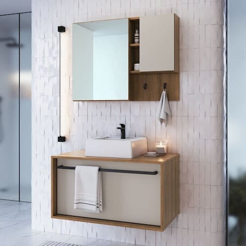 A renovação do seu banheiro a seu alcance, ou melhor seu banheiro mais elegante e charmoso com a nova coleção da Prodecor! Esse lindo conjunto de gabinete com cuba e espelheira traz todo o requinte que o seu banheiro precisa. O gabinete conta com puxador/toalheiro em aço com pintura epóxi e uma uma gaveta. Já a sua espelheira possui nicho aberto, suporte para toalhas, montagem flex (dir/ esq), uma ótima porta com espelho e prateleiras internas. Ambos para acomodar todos os seus pertences de forma organizada e prática. Um diferencial maior é que suas toalhas são acomodadas bem a sua frente sem precisar furar parades. Componha agora mesmo o seu banheiro com a coleção da Prodecor! Produto acompanha cuba. Altura do Conjunto: 103 cm Ambiente: null Ambiente Principal: Banheiro codigo_ean: 7909903975961 Cor: Mel/Arenas Cor do Produto: Mel/Arenas Informação Complementar: 1x Armário Espelheira para Banheiro com 2 Portas e Nichos Mel/Arenas Largura: 80 cm Altura: 60 cm Peso: 12,1 kg Profundidade: 14 cm Necessita Montagem: Sim