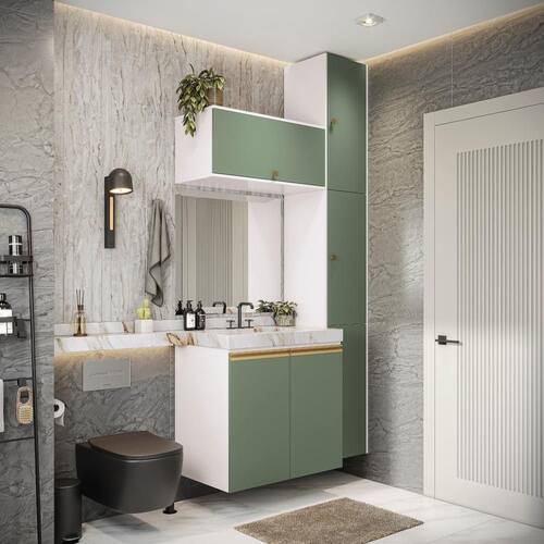Modernidade e beleza sempre andam juntos, principalmente se aliados a qualidade do 100% MDF da Celeste da Kappesberg. Compacto e funcional, o combo CB1284 conta com cinco peças e amplo espaço para organizar toalhas, cestos e demais itens do seu dia a dia. Ideal para todos os espaços, ele é fácil de adaptar, e com até sete camadas de pintura, a caixaria é na cor branco brilho, enquanto as frentes são na cor verde oliva, com acabamento fosco. A combinação perfeita para todos os ambientes, garantindo sofisticação, estilo e praticidade na limpeza, deixando seu banheiro completo. As portas contam com amortecimento, garantindo um fechamento suave, sem ruído e mais durabilidade, e para completar a beleza dos módulos, os puxadores, metálicos na cor dourada, contam com modelos diferentes no balcão e aéreos, transformando seu projeto com estilo. Aposte na Celeste e monte seu banheiro com toda a beleza e praticidade que a Kappesberg oferece.