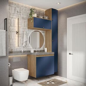 Modernidade e beleza sempre andam juntos, principalmente se aliados a qualidade do 100% MDF da Celeste da Kappesberg. Compacto e funcional, o combo CB1284 conta com cinco peças e amplo espaço para organizar toalhas, cestos e demais itens do seu dia a dia. Ideal para todos os espaços, ele é fácil de adaptar, e com até sete camadas de pintura, a caixaria é na cor nogueira, com acabamento touch, enquanto as frentes são em azul profundo, com acabamento fosco. Uma combinação sofisticada e única, que trará conforto e elegância para todos os ambientes, deixando seu banheiro completo. As portas contam com amortecimento, garantindo um fechamento suave, sem ruído e mais durabilidade, e para completar a beleza dos módulos, os puxadores, metálicos na cor dourada, contam com modelos diferentes no balcão e aéreos, transformando seu projeto com estilo. Aposte na Celeste e monte seu banheiro com toda a beleza e praticidade que a Kappesberg oferece.