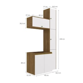 Acabamento: Pintura Brilho / Pintura Touch | Cor: Nogueira/Branco | Dobradiça: Com Amortecimento / Sem Amortecimento | Garantia: 3 meses para defeito de fabricação | Matéria-prima: MDF | Peso suportado por cada prateleira: 7 kg | Puxadores: Alumínio / Metálicos | Quantidade de portas: 1 / 2 | Quantidade de prateleiras: 1 | Sistema de montagem: Parafuso Philips | Tipo de porta: Bater