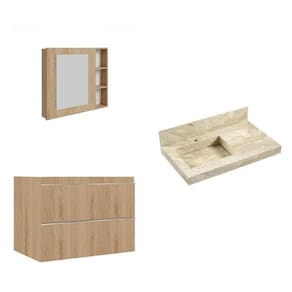 O Conjunto é composto por GABINETE + ESPELHEIRA + LAVATÓRIO. GABINETE fabricado em MDP BP (15mm). Puxadores de alumínio anodizado; caixaria estruturada com cantoneiras metálicas; gavetas com corrediças telescópicas proporcionando abertura total das mesmas; gaveta com divisores e higiênico organizador dental (removível e lavável); e gaveta interna com manta anti-derrapante, protegendo o fundo da mesma. ESPELHEIRA possuí espelho de 550 X 390 X 03 mm com acabamento lapidado, estruturado em porta de MDP BP (15mm). Possui prateleiras internas, porta com dobradiças slow, com sistema de amortecedor e nicho com prateleiras ao lado, para maior organização. LAVATÓRIO com cuba esculpida, fabricado em porcelanato, com baixíssima absorção de umidade, resistente a riscos e manchas. Gabinete e Espelheira Altura do Conjunto: 70 cm Ambiente: null Ambiente Principal: Banheiro Cor: Wood/Travertino Informação Complementar: 1x Lavatório em Porcelanato para Banheiro 80cm com Cuba Esculpida Travertino Largura: 80 Altura: 22.2 Peso: 17.935 Profundidade: 48.5 Necessita Montagem: Não