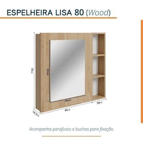 1x Espelheira para Banheiro Lisa 80cm Wood Largura: 80 cm Altura: 70 cm Peso: 13,85 kg Profundidade: 10,3 cm Necessita Montagem: Não