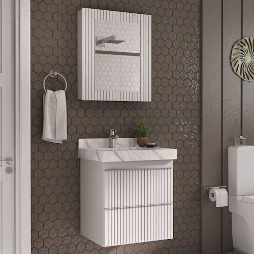 O Conjunto é composto por GABINETE + ESPELHEIRA + LAVATÓRIO. GABINETE fabricado em MDP BP (15mm), com ripas autênticas de HDF BP (06mm), na largura de 20mm. Puxadores de alumínio anodizado; caixaria estruturada com cantoneiras metálicas; gavetas com corrediças telescópicas proporcionando abertura total das mesmas; gaveta com divisores e higiênico organizador dental (removível e lavável); e gaveta interna com manta anti-derrapante, protegendo o fundo da mesma. ESPELHEIRA possuí espelho de 550 X 390 X 03 mm com acabamento lapidado, estruturado em porta com ripas autênticas de HDF BP (06mm). Possui prateleiras internas, para maior organização, e porta com dobradiças slow, com sistema de amortecedor. LAVATÓRIO com cuba esculpida, fabricado em porcelanato, com baixíssima absorção de umidade Altura do Conjunto: 70 cm Ambiente: null Ambiente Principal: Banheiro Cor: Branco Informação Complementar: 1x Lavatório em Porcelanato 60cm com Cuba Esculpida Lavatórios Calacata Largura: 60 Altura: 22.2 Peso: 14.79 Profundidade: 48.5 Necessita Montagem: Não