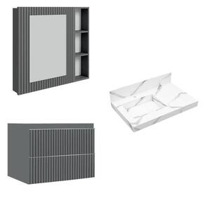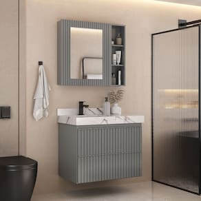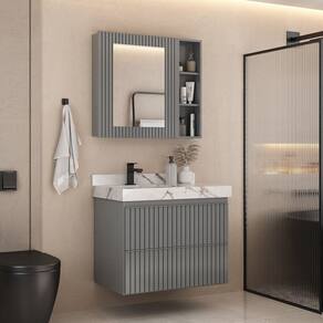 O Conjunto é composto por GABINETE + ESPELHEIRA + LAVATÓRIO. GABINETE fabricado em MDP BP (15mm), com ripas autênticas de HDF BP (06mm), na largura de 20mm. Puxadores de alumínio anodizado; caixaria estruturada com cantoneiras metálicas; gavetas com corrediças telescópicas proporcionando abertura total das mesmas; gaveta com divisores e higiênico organizador dental (removível e lavável); e gaveta interna com manta anti-derrapante, protegendo o fundo da mesma. ESPELHEIRA possuí espelho de 550 X 390 X 03 mm com acabamento lapidado, estruturado em porta com ripas autênticas de HDF BP (06mm). Possui prateleiras internas, porta com dobradiças slow, com sistema de amortecedor e nicho com prateleiras ao lado, para maior organização. LAVATÓRIO com cuba esculpida, fabricado em porcelanato, com baix Altura do Conjunto: 70 cm Ambiente: null Ambiente Principal: Banheiro Cor: Cinza Informação Complementar: 1x Lavatório em Porcelanato 80cm Com Cuba Esculpida Lavatórios Calacata Largura: 80 Altura: 22.2 Peso: 17.935 Profundidade: 48.5 Necessita Montagem: Não