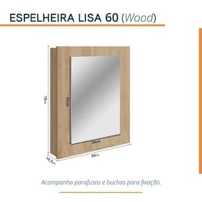 1x Espelheira para Banheiro Lisa 60cm Wood Largura: 60 cm Altura: 70 cm Peso: 11,85 kg Profundidade: 10,3 cm Necessita Montagem: Não