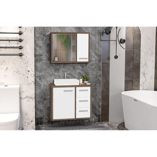 Composto por Espelheira com armário com porta, prateleira interna e espelho, e Gabinete com duas portas, três gavetas com corrediças telescópicas e cuba de apoio / sobrepor inclusa.