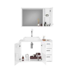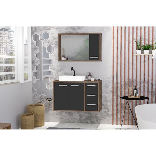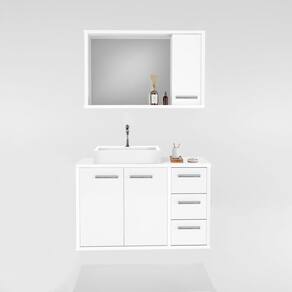 Composto por Espelheira com armário com porta, prateleira interna e espelho, e Gabinete com duas portas, três gavetas com corrediças telescópicas e cuba de apoio / sobrepor inclusa.