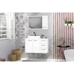 Composto por Espelheira com armário com porta, prateleira interna e espelho, e Gabinete com duas portas, três gavetas com corrediças telescópicas e cuba de apoio / sobrepor inclusa.
