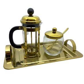 Contém: 1 açucareiro de vidro com tampa e colheres em aço inox com pvd dourado 1 cafeteira prensa francesa 350ml de vidro e aço inox com pvd dourado 1 bandeja retangular pequena de 30cmx17cm em aço inox com pvd dourado