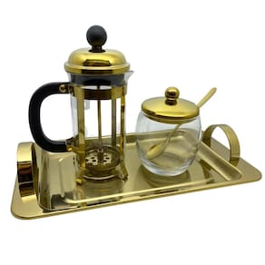 Contém: 1 açucareiro de vidro com tampa e colheres em aço inox com pvd dourado 1 cafeteira prensa francesa 350ml de vidro e aço inox com pvd dourado 1 bandeja retangular pequena de 30cmx17cm em aço inox com pvd dourado