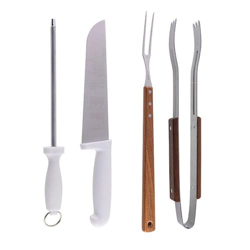 - Cor: Faca e Chaira Cabo branco, Garfo e Pegador Cabo marrom, Lamina Prata