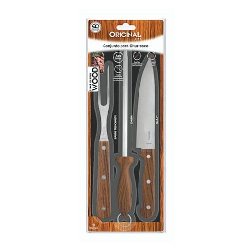 Conjunto para Churrasco Wood Aço Inox Faca, Chaira e Garfo - Line O Conjunto de Churrasco Design Wood da Line é indispensável para o seu churrasco, é composto de faca, chaira e garfo trinchante para servir e manipular as carnes na grelha. Todas as peças são feitas com qualidade e cabo com design madeira para durar mais e seu churrasco ser sempre bem servido. Utilização: Para cortar carnes, grelhar alimentos e afiar facas. Cuidados: - Para manter seus utensílios sempre brilhando, lave com esponja macia, sabão ou detergente neutro. Produtos abrasivos como palha de aço podem riscar e prejudicar o brilho - Seque imediatamente para evitar manchas - Recomenda-se o uso de água quente para melhorar o brilho - Não guarde em local úmido, a umidade pode provocar manchas. Dados Técnicos Referencia: SL0446 Itens Inclusos: 1 Chaira - 30 x3 cm - 1 Faca - 28 x 3,5 cm - 1 Garfo - 23,5 x 2cm Composição: Aço Inox