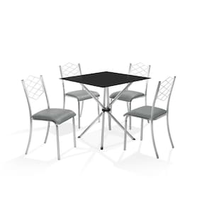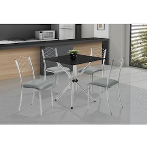 Conjunto de Mesa LANA - 4 Cadeiras Ortenia Conjunto design Slim, moderno e compacto. Mesa em aço cromado polido de alto brilho, pré montada, simples e funcional, vidro Preto serigrafado Temperado Preto quadrado 0,80x0,80, dando todo charme ao conjunto. Cadeiras resistentes e reforçadas, de aço cromado polido de alto brilho, detalhe diferenciado nos pés traseiro da cadeira, no tubo Olongo, trazendo diferencial ao seu visual, encosto em amarado e anatômico, proporcionando conforto ao encostas, assento em pinus e anatômico dando o diferencial e conforto na cadeira. fixados com porcas garras. Produtos de montagem fácil e funcional. Acabamento da Cadeira/Banco: Cromado Acabamento da Mesa: Cromado Almofada do assento: Fixa Altura do Conjunto: 85 cm Ambiente Principal: Cozinha Cadeira/Banco estofada: Sim Cadeira/Banco suporta até: 100 kg Complexidade da Montagem: Baixa: pode ser montado por uma pessoa sozinha Cor: Cromado/Cinza/Preto Cor do Produto: Cromado/Cinza/Preto Enchimento do Assento: Espuma D-12 Escala de Brilho: Brilhante Espessura do Tampo: 6 mm Estrutura do Assento: Pinus Estrutura do Encosto: Aramado em Aço Cromado Itens Inclusos: 1 Mesa, 4 Cadeiras, Kit Ferragens e Manual de Montagem Linha ou Coleção: Lana/Ortenia Manual de Montagem e Instalação: https://cdn2.madeiramadeira.com.br/atributo/aco-nobre-moveis/1070180-aconobrelauraortencia.pdf Material da Base da Mesa: Aço Material da Estrutura da Cadeira: Aço Carbono Medida da Base (A x L x P): 76x53x53 cm Medida da Cadeira/Banco (A x L x P): 85x38x47 cm Medida da Mesa (A x L x P): 77x80x80 cm Medida do Tampo (L x C x E): 80x80x0,6 cm Mesa suporta até: 20 kg Necessita Montagem: Sim Origem do Produto: Nacional Peso da Cadeira/Banco: 2,58 kg Peso da Mesa: 15,76 kg Possui Apoio para Braços: Não Possui Apoio Para os Pés: Não Possui Suporte Giratório: Não Recomendações de Uso, Manutenção e Limpeza: Limpeza com pano macio e levemente umedecido. Não ultilizar solventes a base e de inflamáveis. Não utilizar produtos abrasivos. Revestimento da Cadeira/Banco: Napa Sistema de Montagem: Parafusos Vidro Temperado: Sim