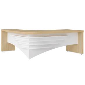 A mesa é feita em MDP, e contém o formato em L com seu design arredondado.