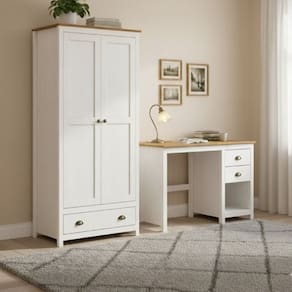 O Conjunto Topázio da Finestra Móveis é ideal para escritório ou home office, trazendo funcionalidade e estilo em perfeita harmonia. A escrivaninha, com duas gavetas e acabamento em branco com tampo Freijó, é ideal para ambientes de estudo ou trabalho. Já o armário oferece amplo espaço com 2 portas e 1 gaveta, móvel 100% em madeira maciça e detalhes sofisticados como puxadores metálicos e cabideiro em alumínio. Um conjunto versátil que une organização, beleza e durabilidade para o dia a dia. Acabamento: Pintura UV Altura do Conjunto: 185.5 cm Ambiente: null Ambiente Principal: Escritório Cor: Branco/Freijó Informação Complementar: 1x Guarda-Roupa Solteiro 2 Portas 1 Gaveta Topázio 100% Madeira Maciça Branco /Freijó Largura: 90,8 cm Altura: 185,5 cm Peso: 48,2 kg Profundidade: 53,5 cm Necessita Montagem: Sim
