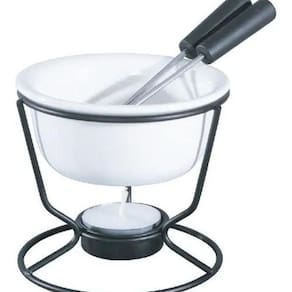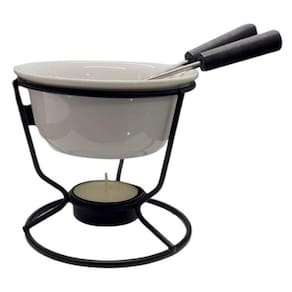 - Dimensões da Peça: 1 Panela: 10 x 10 x 4cm 1 Suporte: 10 x 9cm 2 Garfos: 14cm 1 Vela: 4cm - Material: Aço Inox, Cerâmica e PP.