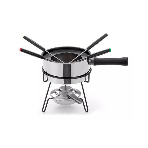 Composto por 9 peças, possui 1 panela em aço inox para fondue com alça, 1 separador de garfos, 1 tripé aramado, 1 placa difusora, 1 queimador e 4 garfos, com cores indicativas.