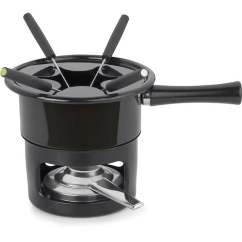 1 Panela Esmaltada Preta, 1 Réchaud Preto, 1 Queimador, 1 Separador De Garfos Preto, 4 Garfos