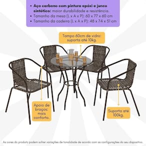 Desfrute de refeições ao ar livre, atividades criativas e momentos relaxantes com o Conjunto para Jardim com Mesa Vidro 60cm e 4 Cadeiras Junco Sintético Multimóveis CR8008. Sua estrutura em aço carbono com pintura epóxi e detalhes em junco sintético garante durabilidade e resistência para o dia a dia. O tampo de vidro da mesa suporta até 10kg e adiciona um toque elegante, proporcionando um visual clean que combina com qualquer estilo de decoração. A cadeira possui apoio de braços e suporta até 100kg.