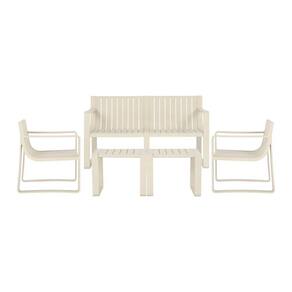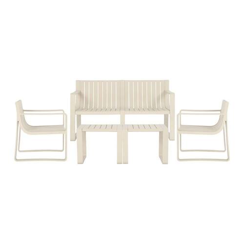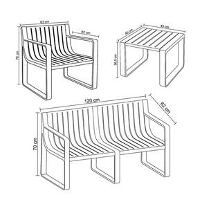 Este conjunto de móveis fixos é ideal para varandas, jardins e áreas de lazer. Composto por cinco peças – um sofá de dois lugares, duas poltronas e duas mesas de centro – o conjunto combina funcionalidade e design para criar um ambiente confortável.