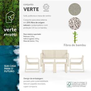O conjunto é fabricado com materiais, como polipropileno e fibra natural ou plástico reciclado. Esses materiais oferecem resistência às intempéries e durabilidade.