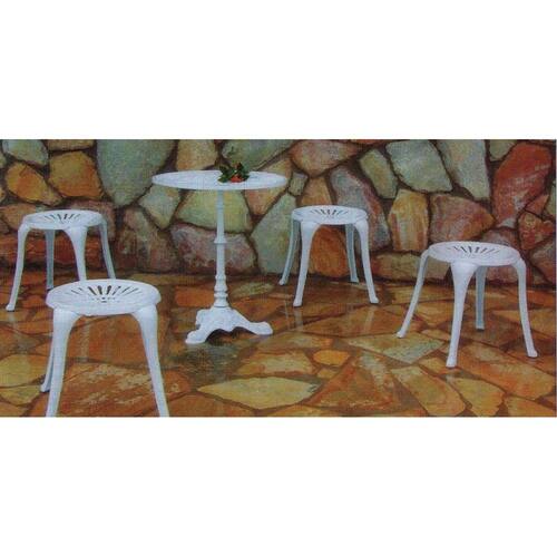 Especificações: 1 Mesa: 68 cm de altura x 60 cm de diâmetro. 4 Banquetas: 44 cm de altura x 38 cm de diâmetro. Cor: Branco. Material: Alumínio fundido. Tipo de pintura: Eletrostática. Vendemos almofadas separadamente. Requer montagem.