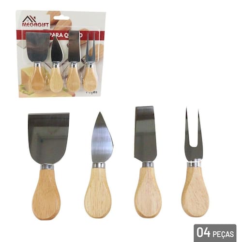 Conjunto Para Queijos e Frios Inox Madeira 4 - Ideal para cortar e servir diversos tipos de queijos e frios para mesa posta;\n- Contém: 1 Faca para queijo cremoso, 1 Faca para queijo macio, 1 Faca para queijo duro, 1 Garfo para servir;\nEspecificações:\nMarca : MEGAGIFT\nTipo de material : Aço Inox, Madeira\nCores ou Estampa : Marrom, prata\nDimensões do Produto : 12 X 3 X 2 CM\nDimensões da Embalagem : 18 X 18 X 2,5 CM\nPeso Bruto (Gramas) : 0.146 Marca: Não Informado