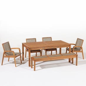 Composto por 1 banco de 180cm, 2 cadeiras com braço, 2 cadeiras sem braço e 1 mesa de 180 cm, o conjunto traço oferece conforto para os seus momentos de lazer, formando o ambiente ideal para desfrutar ocasiões de descontração ou confraternizações com seus amigos e familiares. São resistentes e com um design exclusivo. Produzidos com madeira de eucalipto reflorestado e trançado por artesãos da região de São Bento do Sul, Santa Catarina, com corda trançada chata de 2,2 cm, cor rami de polipropileno. Ideal para varandas, sacadas, espaço gourmet ou churrasqueiras e áreas de lazer cobertas, bem como para compor um ambiente aconchegante na sua sala de jantar.
