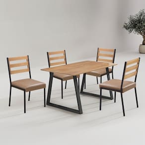 Este conjunto é composto por 4 cadeiras com assento estofado, garantindo conforto, e encosto em madeira maciça, que confere um toque natural e elegante. A estrutura das cadeiras é em aço, proporcionando alta resistência e durabilidade. A mesa possui tampo em MDF com acabamento laminado na tonalidade Cinamomo, que traz sofisticação ao ambiente, além de base em aço, assegurando estabilidade e robustez. Ideal para compor salas de jantar, cozinhas ou espaços gourmet com estilo contemporâneo. Medida da Mesa (A x L x P): 77,6 cm x 120 cm x 90 cm Peso da Mesa: 29,7 kg Mesa suporta até: 10 kg Acabamento da Cadeira/Banco: Pintura Texturizada Acabamento da Mesa: Pintura Texturizada Ambiente Principal: Sala de Jantar Cadeira/Banco Estofada: Somente Assento Estofado Cadeira/Banco estofada: Somente Assento Estofado Cadeira/Banco suporta até: 120 kg codigo_ean: 7900288174659 Complexidade da Montagem: Média: pode ser montado por mais de uma pessoa e/ou necessite de maior conhecimento para montagem Cor: Preto Fosco / Bege Cor do Produto: Preto Fosco / Bege Cor Secundária: Cinza De Canto (Canto Alemão): Não Escala de Brilho: Semi-Fosco Espessura do Tampo: 16 mm Formato do Tampo: Retangular Itens Inclusos: 1 Mesa, 4 Cadeiras, Manual de Montagem e Kit Ferragens. Linha ou Coleção: Londres Manual de Montagem e Instalação: https://product-hub-prd.madeiramadeira.com.br/781929007/documents/3d67219d-68e4-4789-b149-d9efcc2fd9522990253493817495798920901.pdf Marca: Tubulares Gol Material da Base da Mesa: Aço Material da Estrutura da Cadeira: Aço Material do Tampo: MDF Medida da Cadeira/Banco (A x L x P): 90 cm x 46 cm x 54 cm Medida do Tampo (L x C x E): 90 cm x 120 cm x 1,6 cm Mesa Extensível: Não Necessita Montagem: Sim Origem do Produto: Nacional Peso da Cadeira/Banco: 5,75 kg Possui Apoio Para os Pés: Não Quantidade de Cadeiras: 4 Quantidade de Lugares: 04 Recomendações de Uso, Manutenção e Limpeza: Limpeza com pano macio e levemente umedecido. Não utilizar solventes a base e de inflamáveis. Não utilizar produtos abrasivos. Sistema de Montagem: Parafusos Marca: Não Informado