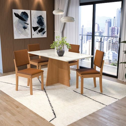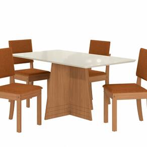 Sua Sala de Jantar de cara nova com a linha Kappesberg. A mesa, em MDP e pintura touch na cor canela, possui os pés dispostos como uma estrela de quatro pontas, além de detalhes em frisos na parte inferior. A escolha ideal para ambientes menores, quando combinada ao tampo retangular, acomoda até quatro pessoas. Em MDF e pintura na cor off white, o destaque fica para o vidro na mesma cor. Medindo 160cm X 90cm e espessura de 3,0cm, ele suporta até 90kg. Já as cadeiras, em MDF, contam com 93,5m de altura, sendo 50cm a altura do assento, 42cm de largura e 54cm de profundidade, e pintura touch na cor canela, suportando até 120kg. Desmontada, tanto o encosto quanto o assento são estofados e recobertos com tecido bouclé terracota, garantindo conforto em todos os momentos.