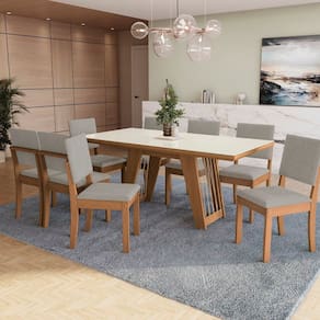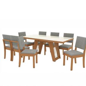 Sua sala de jantar mais completa com a Linha Kappesberg. A mesa, em MDP e formato retangular, possui detalhes em corda nas laterais, garantindo o diferencial da peça. Com 77cm de altura, 100cm de largura e 40cm de profundidade, quando combinada ao tampo retangular, acomoda até oito pessoas. Em MDP e na cor canela, o destaque fica para o vidro na cor off white e o detalhe da quina reta, e com medidas de 180cm X 90cm e espessura de 5,0cm, ele suporta até 90kg. Já as cadeiras, em MDF, pintura touch na cor canela e medindo 93,5m de altura, sendo 50cm a altura do assento, 42cm de largura e 54cm de profundidade, suportam até 120kg. Desmontada, o encosto e o assento são estofados e recobertos com tecido bouclé cinza, garantindo o máximo de conforto.