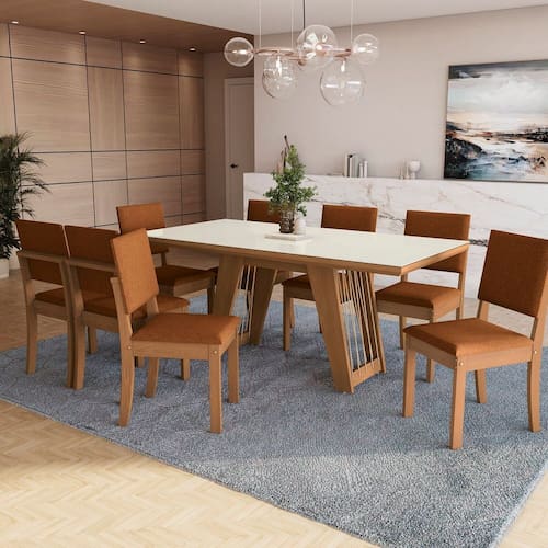 Sua sala de jantar mais completa com a Linha Kappesberg. A mesa, em MDP e formato retangular, possui detalhes em corda nas laterais, garantindo o diferencial da peça. Com 77cm de altura, 100cm de largura e 40cm de profundidade, quando combinada ao tampo retangular, acomoda até oito pessoas. Em MDP e na cor canela, o destaque fica para o vidro na cor off white e o detalhe da quina reta, e com medidas de 180cm X 90cm e espessura de 5,0cm, ele suporta até 90kg. Já as cadeiras, em MDF, pintura touch na cor canela e medindo 93,5m de altura, sendo 50cm a altura do assento, 42cm de largura e 54cm de profundidade, suportam até 120kg. Desmontada, o encosto e o assento são estofados e recobertos com tecido bouclé terracota, garantindo o máximo de conforto.