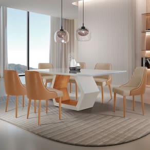 As cadeiras Roma destacam-se pelo visual atemporal e pela estrutura em madeira maciça, que garante resistência e longa durabilidade. O assento e o encosto são revestidos com tecido em linho, proporcionando conforto no uso diário, enquanto o detalhe na parte traseira das cadeiras traz um charme sutil com um material de acabamento elegante. Medida da Mesa (A x L x P): 80cm x 180cm x 90cm Peso da Mesa: 74,5 kg Mesa suporta até: 60 kg Acabamento da Cadeira/Banco: Pintura Acabamento da Mesa: Verniz Almofada do assento: Fixa Almofada do encosto: Fixa Ambiente Principal: Sala de Jantar Cadeira/Banco estofada: Encosto e Assento Estofados Cadeira/Banco Estofada: Encosto e Assento Estofados Cadeira/Banco suporta até: 130 kg Cadeira/Banco Suporta Até: 130.0000 codigo_ean: 7908128426104 Complexidade da Montagem: Baixa: pode ser montado por uma pessoa sozinha Configuração do Conjunto: Mesa com Cadeiras Cor: Star Caramelo/ Off White / Cinamomo Imbuia Cor do Produto: Star Caramelo/ Off White / Cinamomo Imbuia Cor do Tampo: Off White Cor Flex: Não Cor Secundária: Marrom De Canto (Canto Alemão): Não Enchimento do Assento: Espuma D-26 Enchimento do Encosto: Espuma D-18 Escala de Brilho: Semi-Brilho Espessura do Tampo: 40 mm Formato do Tampo: Retangular Informações Complementares: As cadeiras são entregues totalmente montadas e prontas para uso, enquanto a mesa chega pré-montada, facilitando a instalação e garantindo praticidade. Itens Inclusos: 1 Mesa, 6 Cadeiras e Kit Ferragens Linha ou Coleção: Sarah / Roma Manual de Montagem e Instalação: https://product-hub-prd.madeiramadeira.com.br/249103827/documents/37f9928e-9b83-4f19-9fa0-33e9ed38a0183145182584417555397829399.pdf Marca: Mobilare Material da Base da Mesa: Madeira Maciça Material da Estrutura da Cadeira: Madeira Maciça Material do Tampo: Tauari Material Principal: Madeira Material Principal das Cadeiras/Bancos: Madeira Maciça Medida da Cadeira/Banco (A x L x P): 92cm x 60cm x 50cm Medida do Tampo (L x C x E): 180cm x 90cm x 4cm Mesa Dobrável: Não Mesa Extensível: Não Montagem Flex: Não Necessita Montagem: Sim Origem do Produto: Nacional Peso da Cadeira/Banco: 10 kg Possui Apoio para Braços: Não Possui Apoio Para os Pés: Não Possui Prateleiras: Não Possui Suporte Giratório: Não Possui Vidro: Sim Quantidade de Cadeiras: 6 Quantidade de Lugares: 06 Recomendações de Uso, Manutenção e Limpeza: Limpar com pano seco. Revestimento da Cadeira/Banco: Courino Sistema de Montagem: Parafusos Tipo de Assento: Fixo Tipo de Encosto: Estofado Tipo de Madeira Maciça da Base da Mesa: Tauari