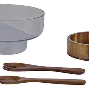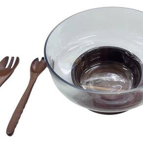 Material de Qualidade: Saladeira em vidro durável e talheres de servir em madeira robusta.