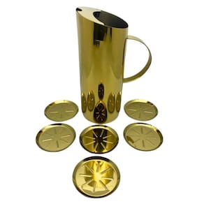 Conjunto Para Suco Aço Inox Dourado Fineza Material Aço Inox Revestimento Nitreto de Titânio Dourado Não é pintura Contém: 6 Porta Copos Dourados Aço Inox 1 Jarra de Aço Inox 1,5L Descrição Conjunto com 6 Porta Copos Dourados Fineza Dimensões do produto: espessura 0.5cm largura total 8.5cm largura da base onde se apoia o copo 7cm O conjunto de Porta Copos Dourado Fineza é produzido com aço inox de qualidade, prezando pela durabilidade e pela beleza o item.Um item que faz toda a diferença na hora de compor a decoração de uma bela mesa. Jarra Dourada em Aço Inox 1,5L Fineza Dimensões do produto 24 18cm A jarra dourada Fineza é um item de alto padrão, com design clean, cantos delicados e capacidade de 1,5l. Fácil de limpar, basta seguir as recomendações de uso. A jarra dourada é feita em de Inox, e o revestimento dourado é de qualidade e com alta durabilidade. O inox mantém sua bebida gelada por muito mais tempo O revestimendo de PVD não descasca, não desbota e não enferruja com o tempo Recomendações de uso: Use apenas sabão ou detergente e o lado macio da esponja. Outros tipos de produtos, como palha de aço, poderão riscar ou prejudicar o brilho. Enxágue bem cada peça a fim de remover totalmente os resíduos dos produtos de limpeza, que, por serem abrasivos, podem prejudicar o inox. Sempre que possível, use água morna, pois renova o brilho do produto. Após a lavagem, enxugue imediatamente o mesmo, caso contrário, as substâncias químicas da água cloro poderão causar manchas. Na lavagem manual evite atrito entre o produto durante o processo de lavagem e no armazenamento, para mantê-los sem riscos. Não recomendado também, o uso de máquina lava louças. Ean: 7893595926434