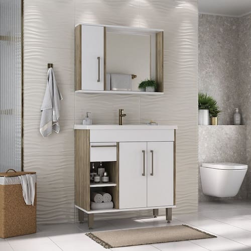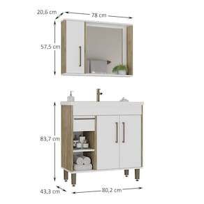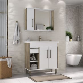 Conjunto de banheiro de 80 cm. Com um Design Contemporâneo foi desenvolvido pensando em qualidade e estilo. Produzido em MDP de 15 mm na cor branca e carvalho cartagena com acabamento semi brilho, que garante maior durabilidade e facilidade de limpeza. Os pés com regulagem de altura facilitam o nivelamento e a limpeza do produto. Acabamento da Cuba: Esmaltado Acabamento da Gaveta: Finish Foil Acabamento da Porta: Finish Foil Acabamento da Prateleira: Finish Foil Acompanha Cuba: Sim Acompanha Manual de Instalação: Sim Acompanha Parafusos Para Fixação Na Parede: Sim Acompanha Tampo: Sim Altura do Espelho: 51 cm Altura dos Pés: 17 cm Ambiente Principal: Banheiro codigo_ean: 7909903904152 Complexidade da Montagem: Baixa: pode ser montado por uma pessoa sozinha Cor: Branco / Carvalho cartagena Cor da Cuba: Branco Cor do Produto: Branco / Carvalho cartagena Cor Interna: Branco Escala de Brilho: Semi-Brilho Escala de Brilho da Porta: Semi-Brilho Escala de Brilho da Prateleira: Semi-Brilho Espessura do Espelho: 3 mm Formato do Espelho: Retangular Furação para Cuba e Torneira: Sim Gaveta com Chave: Não Itens Inclusos: 1 Gabinete, 1 Espelheira, 1 Cuba, Manual de Montagem e Kit Ferragens Largura do Espelho: 43 cm Manual de Montagem e Instalação: https://product-hub-prd.madeiramadeira.com.br/937282/documents/5df9aa75-4258-4e1e-abf3-f9c8303e494c2279772336517249576362794.pdf Material da Cuba: Mármore Sintético Material da Gaveta: MDP Material da Porta: MDP Material da Prateleira: MDP Material do Tampo: Mármore Sintético Material dos Pés: ABS Material Principal: MDP Medida da Cuba (C x L x P): 79,8cm x 37,6cm x 2,4cm Medida da Espelheira (A x L x P): 57,5cm x 78cm x 20,6cm Medida do Gabinete (A x L x P): 83,7cm x 80,2 cm x 43,3cm Necessita Montagem: Sim Origem do Produto: Nacional Pés Reguláveis: Sim Peso: 38 kg Peso Máximo por Gaveta: 3 kg Peso Máximo por Prateleira: 5 kg Possui Espelheira: Sim Possui Gabinete: Sim Possui iluminação: Não Possui Pés: 04 Possui Porta de Vidro: Não Possui Rodízio: Não Produto Montado: Sim Recomendações de Uso, Manutenção e Limpeza: Limpeza com pano úmido e não abrasivo Sapatas Niveladoras: Sim Sistema de Montagem: Parafusos, cavilhas Tamanho do Espelho (A x L): 51cm x 43cm Tipo de Corrediça da Gaveta: Metálica Telescópica Tipo de Dobradiça/Corrediça da Porta: Metálica Tipo de Porta: Bater Tipo de Puxador da Gaveta: Externo Tipo de Puxador da Porta: Externo Marca: Ozini