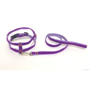 Peitoral confeccionado em tecido de veludo liso e nylon; Presilha com regulagens de tamanho em plastico resistente; Guia em tecido de veludo liso e nylon; Mosquetão médio com trava de segurança; Indicado para cachorros de pequeno e médio porte. Cor: roxo