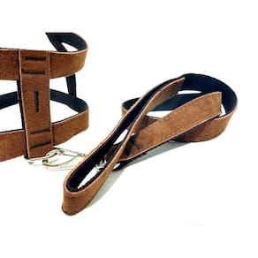 Peitoral confeccionado em tecido de camurça de 25 mm; costura reforçada altamente resistente; fivela prateada com regulagens; guia confeccionada em tecido de camurça de 25 mm, com 60 cm; mosquetão prateado com trava de segurança; ideal para cachorros de médio porte; cor: marrom, tamanho: 4 tabela de medidas nº. 04 corpo de 36 cm; passeie com total conforto e beleza utilizando o conjunto peitoral grande de camurça, trazendo estilo e segurança. Marca: Nica pet Ean: 7437331436735
