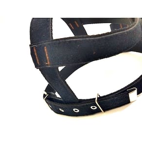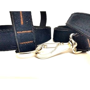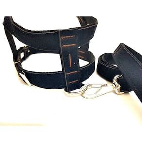 Peitoral confeccionado em tecido de camurça de 25 mm; costura reforçada altamente resistente; fivela prateada com regulagens; guia confeccionada em tecido de camurça de 25 mm, com 60 cm; mosquetão prateado com trava de segurança; ideal para cachorros de médio porte; cor: preta