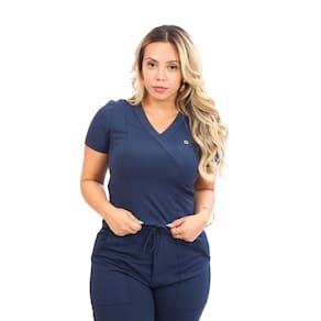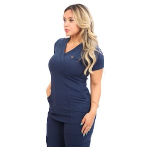 Nosso conjunto de uniforme cirúrgico Scrub Verona, com design de pijama, apresenta uma blusa com decote em V, detalhes recortados, 2 bolsos frontais, cintura marcada com elástico nas costas e calça estilo cargo de cintura alta com bolsos frontais, laterais e traseiros. Feito com 90% de poliamida e 10% de elastano. Marca: Rachele