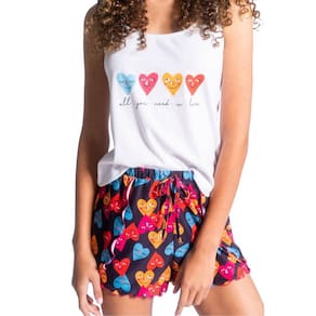 Apresentamos nosso encantador conjunto de pijama estilo short doll, perfeito para noites de verão cheias de charme e conforto. Este conjunto é composto por uma regata e um short, ambos adornados com uma estampa de corações adorável, adicionando um toque de romance ao seu visual de dormir.