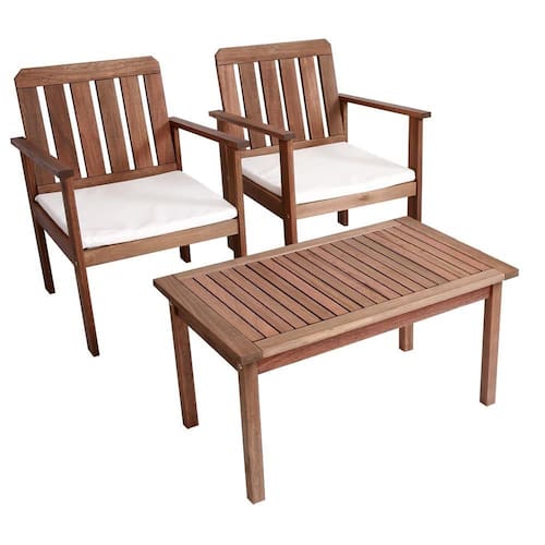 O conjunto possui um charme especial seu design inovador garante modernidade e elegância ao ambiente. Formado por 2 poltronas e mesa, o conjunto confere beleza e aconchego ao seu lar. Usamos a melhor pintura para madeira, impregnante Stain Blinder ideal para áreas externas, por oferecer proteção e resistência a água, proteção UV e as mudanças climáticas com um lindo acabamento na tonalidade Nogueira. As almofadas são confeccionadas com material resistente, Algodão Cru. Assim, o conjunto sofre menor impacto da ação do tempo e possui maior durabilidade.