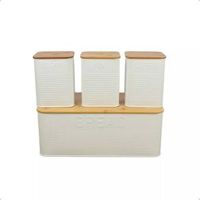 Material: Metal e Bambu Porta Pão: 33x18x12 cm Potes: 10x10x12 cm Cor: Branco