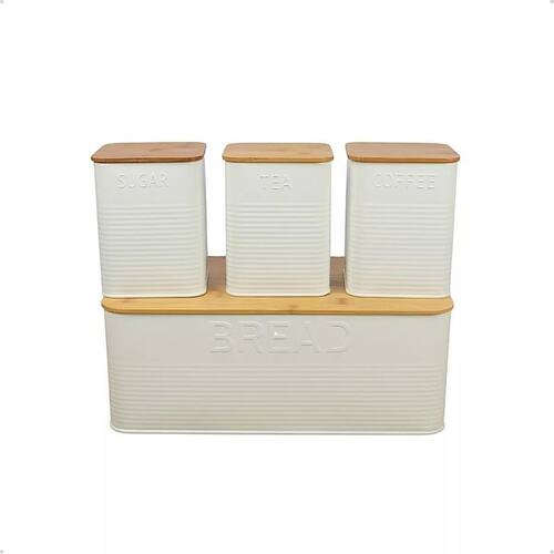 Conjunto Porta Pão Bambu 3 Potes White BH23353 Conjunto elegante para a cozinha, composto por um porta pão e potes para café, açúcar e chá. Fabricado em metal na cor branca com tampas de bambu, ideal para manter os alimentos protegidos e contribuir com a decoração do ambiente.