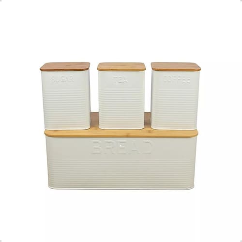 Conjunto Porta Pão Bambu 3 Potes White BH23353 Conjunto elegante para a cozinha, composto por um porta pão e potes para café, açúcar e chá. Fabricado em metal na cor branca com tampas de bambu, ideal para manter os alimentos protegidos e contribuir com a decoração do ambiente.