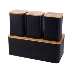 Contém: 4 recipientes Material: Metal e Bambu Porta Pão: 33x18x12 cm Potes: 10x10x12 cm Cor: Preto Marca: Mimo Style Ean: 7908216128453