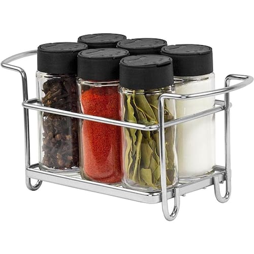 Suporte de 06 mini porta temperos de vidro, produzido em aço cromado, material conhecido por sua durabilidade e resistência.